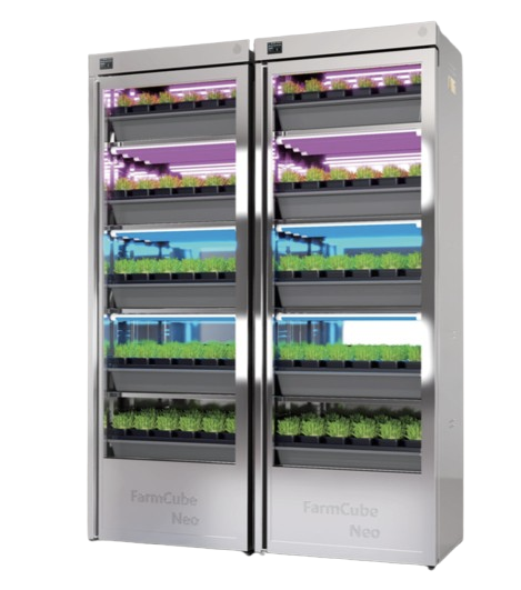 The FarmCube Neo is a compact, ‘Plug-&-Play’ smart aeroponic microgreens unit. It features a fully enclosed cabinet made with food-grade materials, enabling efficient, clean, and stable microgreens production within a limited footprint.